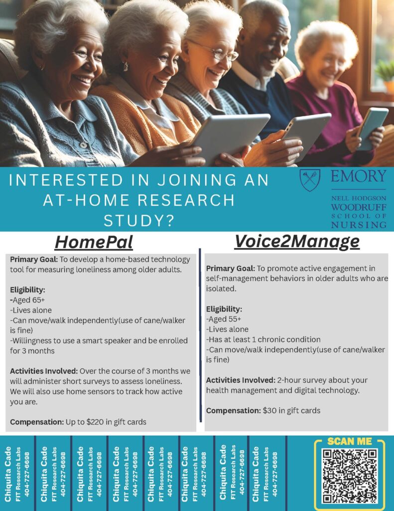 FIT Research Labs is working to support older adults living alone through innovative, at-home studies focused on health, loneliness, and self-management. Current opportunities include participating in a 3-month study using smart speakers and sensors, or completing a health survey, with compensation provided. These studies aim to improve quality of life while empowering participants to engage in their own care.